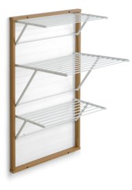 The Karim wall mountable airer is made from sustainably sourced solid beechwood (frame), powder-coated aluminium (drying rails), and nylon (drying grids).